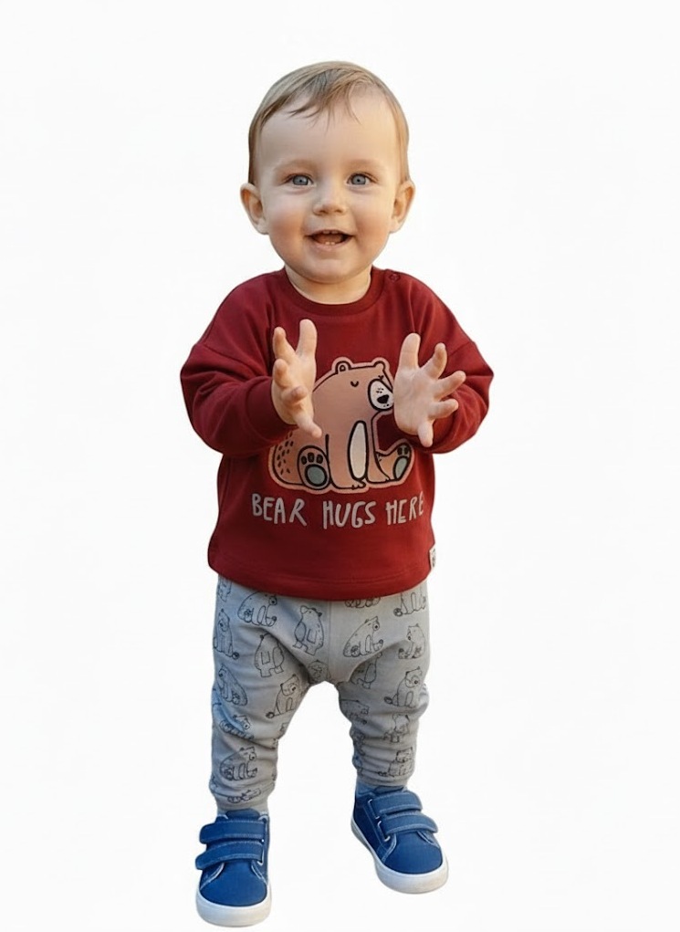 Комплектът се състои от блузка и долнище. Блузката е кафява, с голяма апликация на бежово мече от плат и бродерия и син надпис отдолу. Закопчава се с две тик-так копченца на лявото рамо. Долнището е в светлосин цвят, с тъмносини фигурки на мечета.