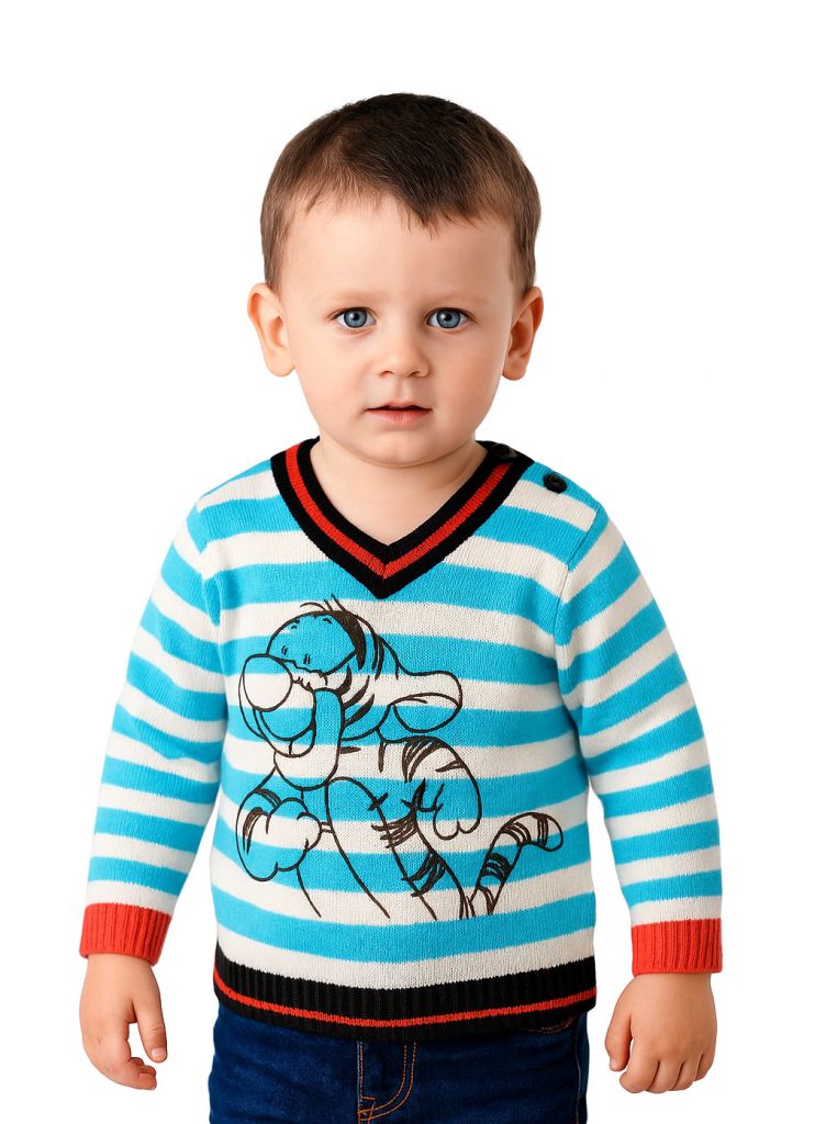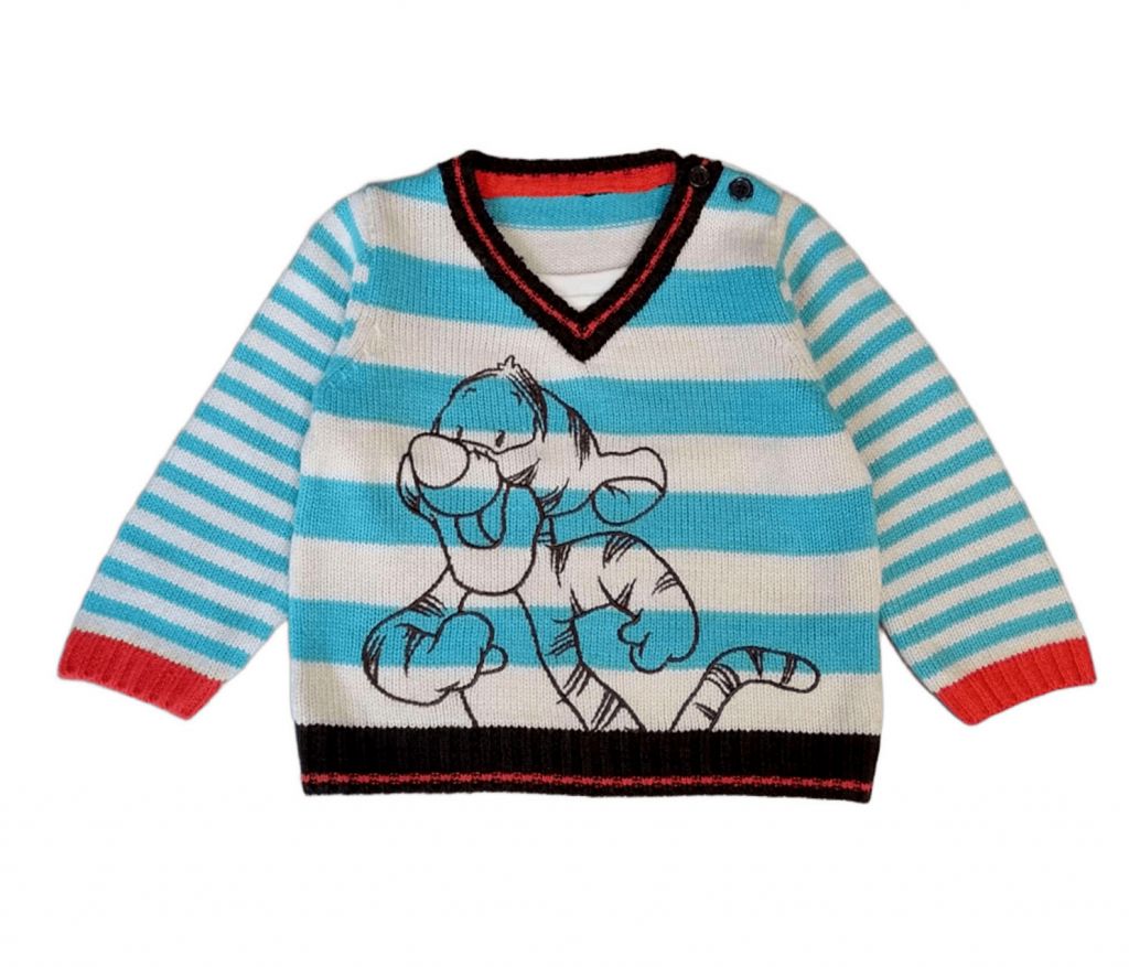 Пуловерът е на райе в светлосиньо и бяло. Има голяма бродерия на тигър на предницата. Деколтето и долната част са с тъмнокафяв ластик и тънка оранжева ивица, а краищата на ръкавите са оранжеви. Закопчава се с две копчета на лявото рамо.