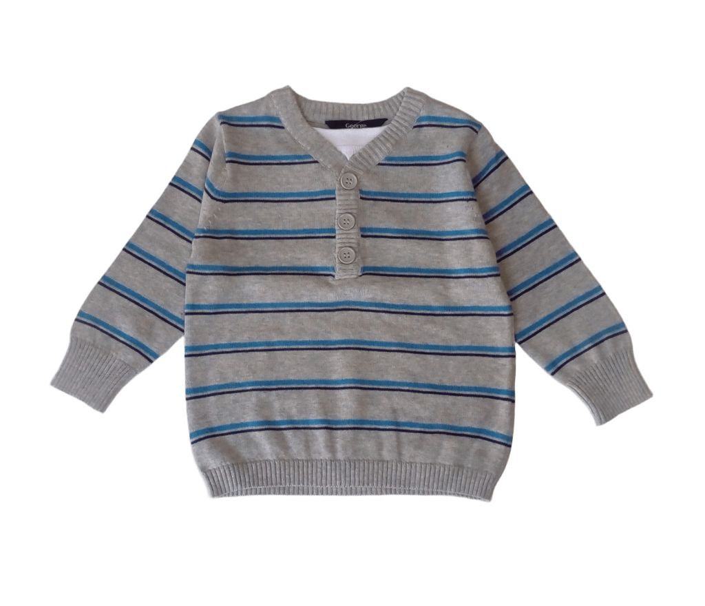 G1810Пуловерът е тънко плетиво в светлосиво, със светли и тъмносини раирани ивици. Има V-образно деколте с три копченца и бяла платка, която имитира облечена отдолу тениска.Марка: GeorgeСъстав: 100% памук