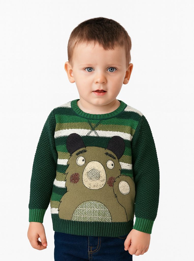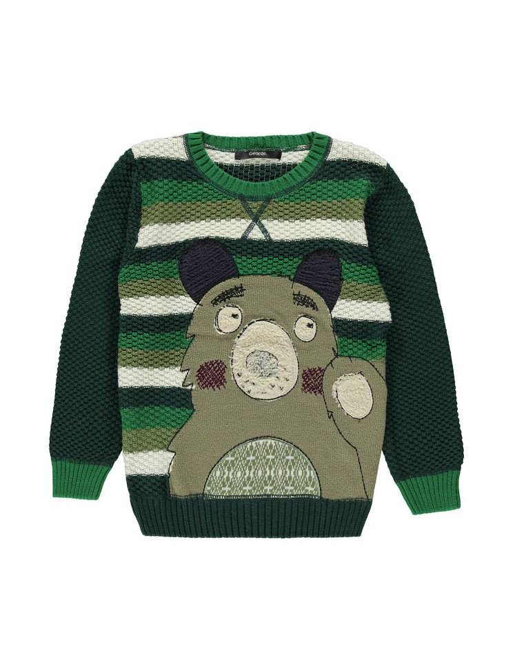 WGM1959Пуловерът е на широки раирани ивици в бяло и различни нюанси на зеления цвят. Ръкавите са в тъмнозелено. Отпред има изображение на мече в светъл маслиненозелен цвят.Марка: GeorgeСъстав: 100% памук
