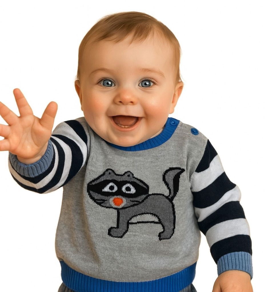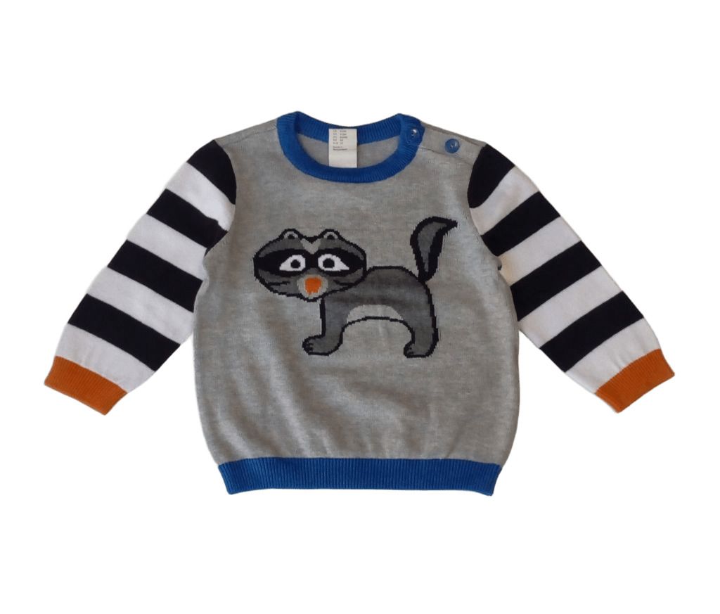 Пуловерът е тънко плетиво в сив цвят, със син ластик около деколтето и талията и с фигурка на енот на предницата. Ръкавите са на широко райе в бяло и черно и с оранжев ластик в края. Има две копченца на лявото рамо за по-лесно обличане.