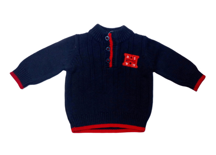 Плетен пуловер в тъмносиньо, с декоративни червени ивици на ластика, ръкавите и яката. От лявата страна има емблема в червено с формата на буква Н и надпис "Heritage sports 1975". Пуловерът е с висока яка, закопчава се с три копчета отпред.