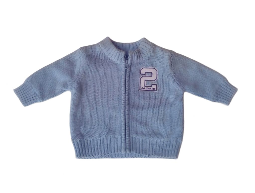G1762Жилетката е плетена, в светлосин цвят, с цип. Има апликирана цифра 2 от лявата страна и бродирани надписи на гърба. Подплатата е от трикотажен плат.Марка: GeorgeСъстав: 100% памук