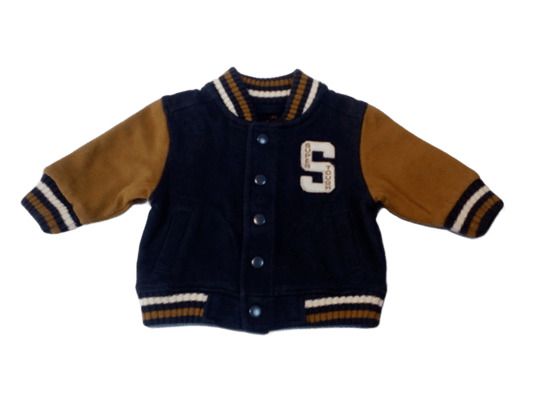 Тъмносин суитшърт, с ръкави в тютюнев цвят. Закопчава се с тик-так копчета, има два джоба, без качулка. От лявата страна има апликирана бяла буква S. Ластиците около деколтето, ръкавите и талията са с широки ивици в тъмносиньо, тютюнево и бяло.