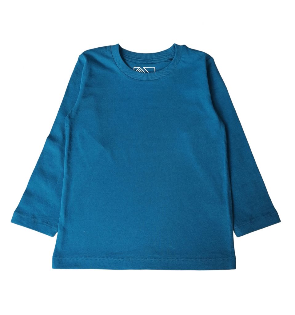 Блузата е с дълъг ръкав, в цвят тъмен тюркоаз.