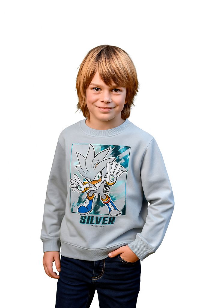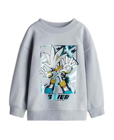Блузата е от светлосиво ватирано трико с изображение на Соник в блестящ тюркоазен цвят.