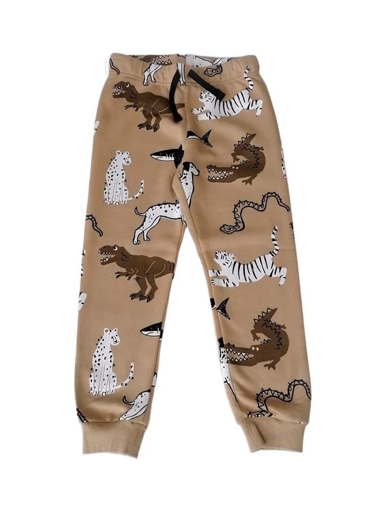 DHM1267Долнището е леко ватирано, в светъл цвят охра, с различни изображения на диви животни в бяло, кафяво и черно.Марка: H&MСъстав: 80% памук, 20% полиестер