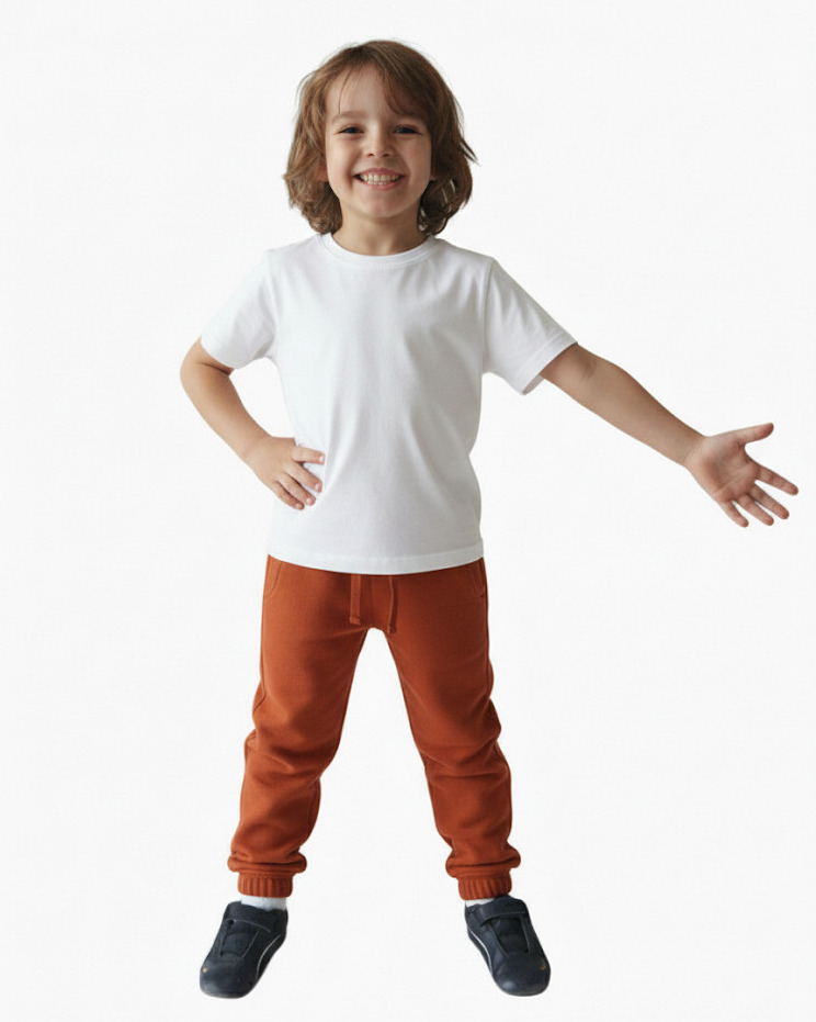 Долнището е от тънко трико в керемиден цвят. Има два джоба и шнур за регулиране на талията.