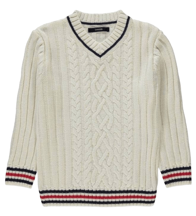 WGM2457Плътен пуловер в бяло, с тънки червени и сини ивици на ластика и ръкавите. Предницата е с различни по големина и форма плетеници.Марка: GeorgeСъстав: 100% памук