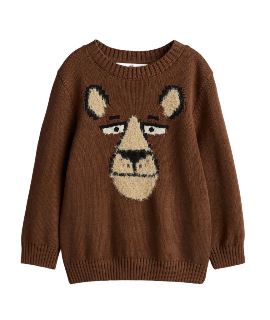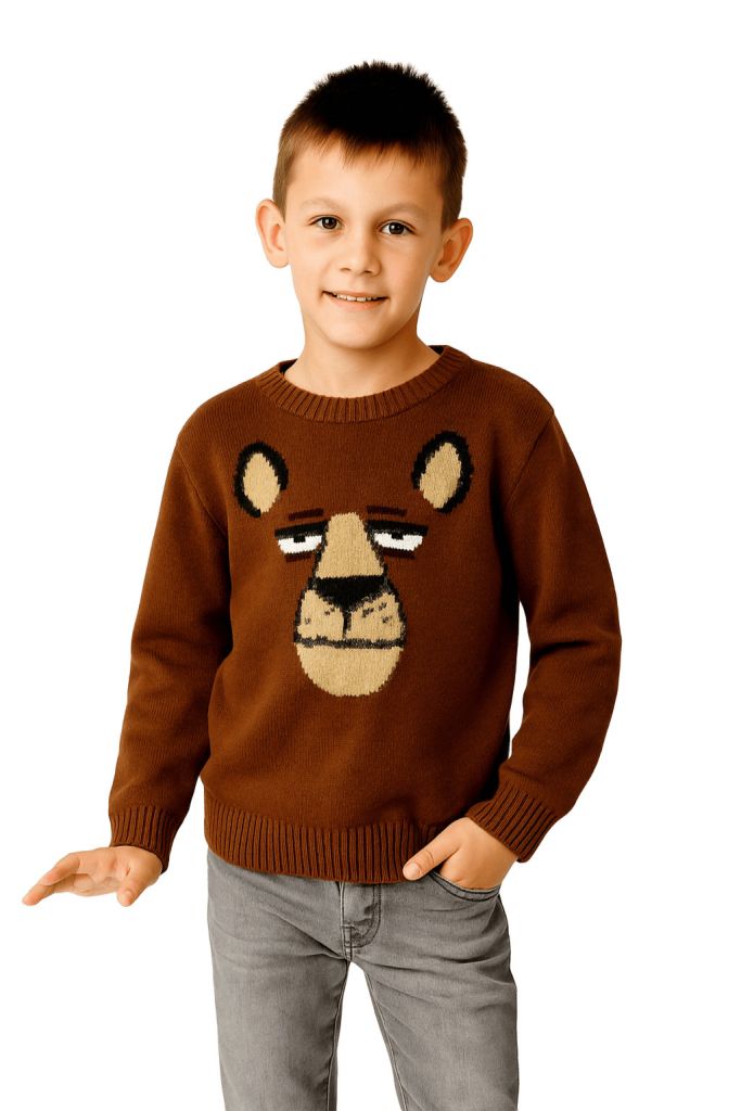 Плетен пуловер в кафяво, с изображение на бежова мечешка муцунка отпред.