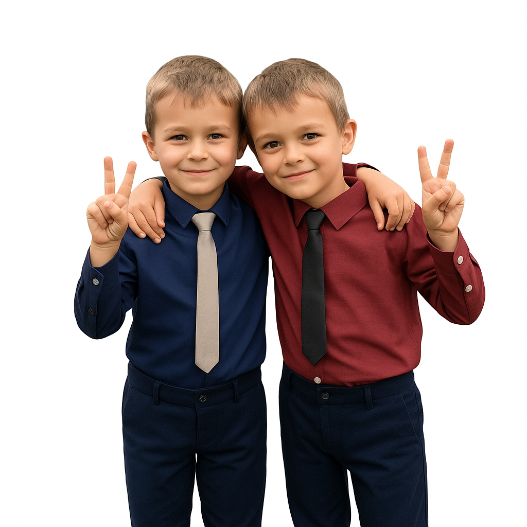 Комплектът се състои от тъмносиня риза с дълъг ръкав и вратовръзка в сребристо-сиво.