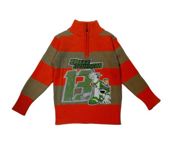 Пуловерът е на широки ивици в светлокафяво и оранжево, с висока яка, която се закопчава с цип. Отпред има изображение на Баз Светлинна година от филма "Играта на играчките". Фигурката е апликирана от плат, с допълнителен ефект от сребрист брокат и бродерия.
