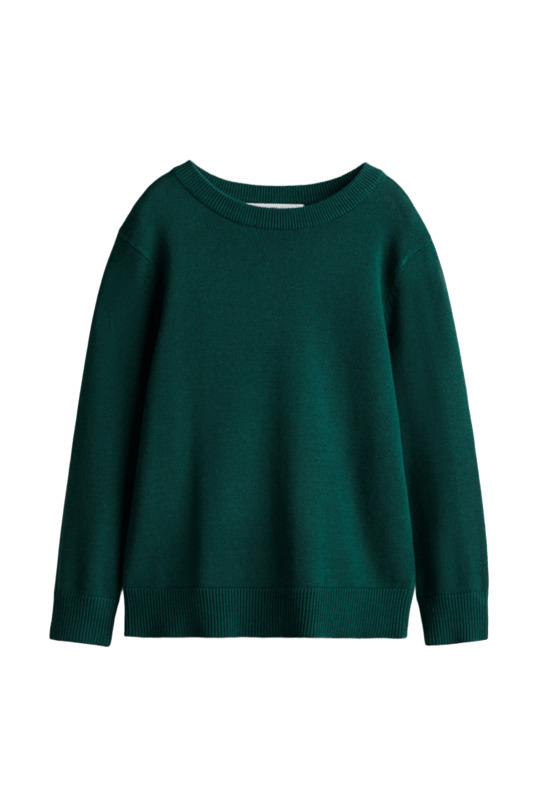 Пуловерът е тънко плетиво в тъмнозелен цвят.