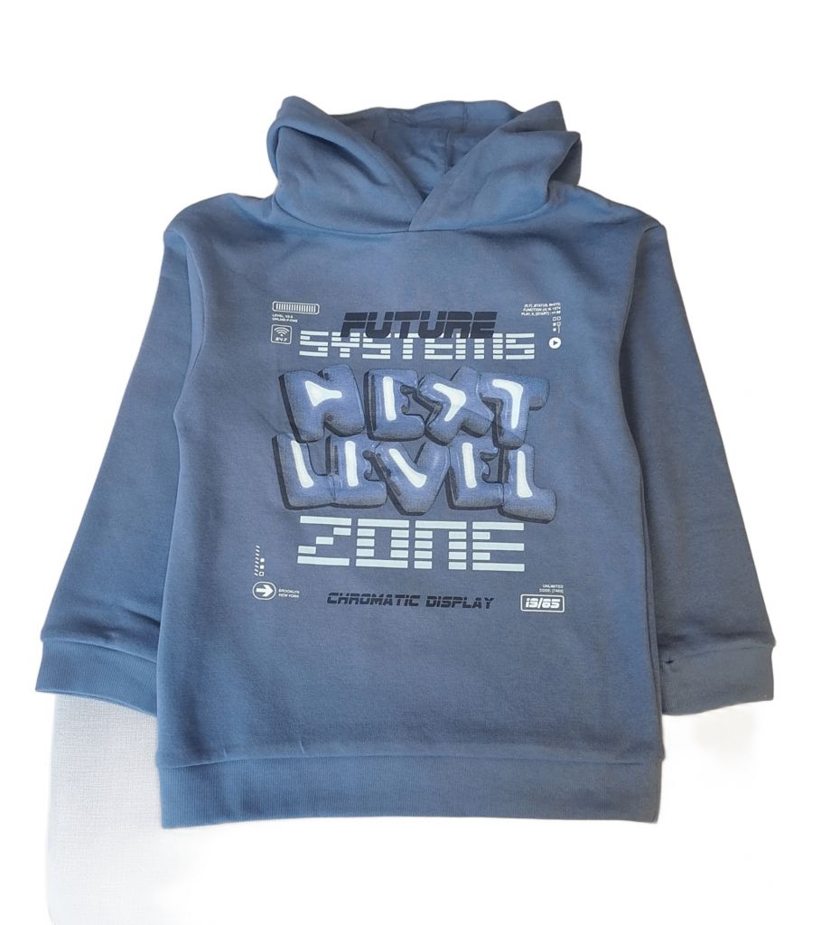 Суитшъртът е с качулка, без цип (худи), в пепелно синьо с надпис NEXT LEVEL отпред.