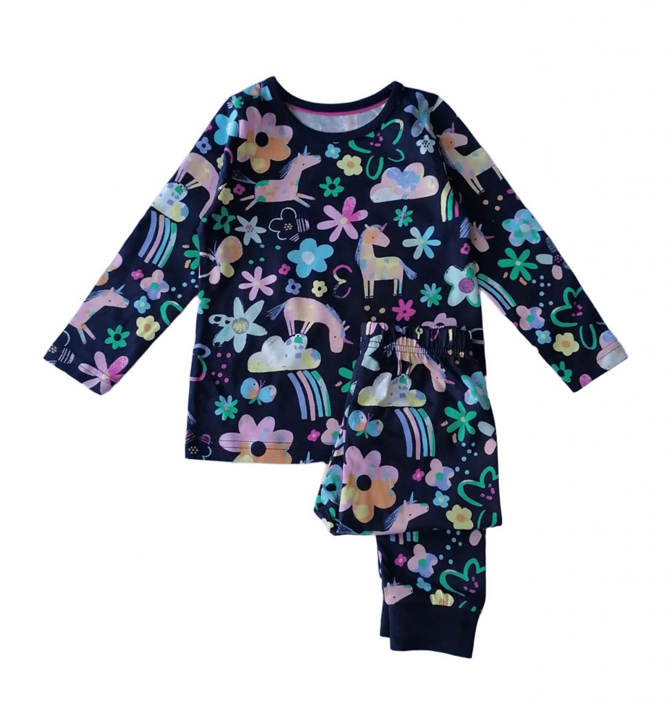 GGE2035Пижамата е с дълъг ръкав и дълго долнище, в тъмносин цвят с шарени фигурки на цветя и еднорози .Марка: GeorgeСъстав: 100% памук