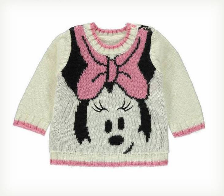 WGF1940Плетен пуловер в бяло с розова ивица по края на ластика, ръкавите и около деколтето. Отпред има изображение на Мини Маус в розово и черно. Има две две копченца на лявото рамо за по-лесно обличане.Марка: GeorgeСъстав: 100% акрил