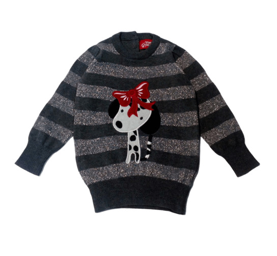 WPF2178Пуловерът е тънко плетиво на райе в сребристо и тъмносиво. Отпред има апликация от плат на кученце с червена панделка. На гърба има две копченца за по-лесно обличане.Марка: H&MСъстав: 92% памук, 8% лурекс