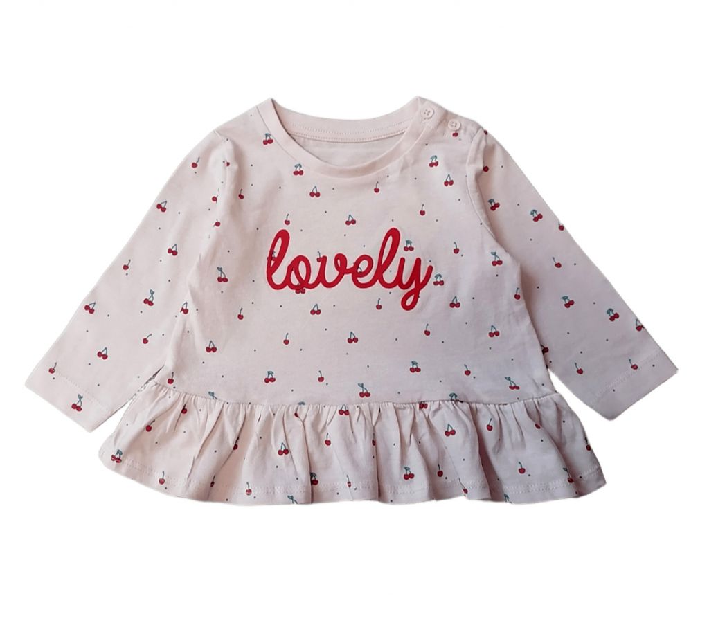 GMAT1278Блузката е светлорозова, с дълъг ръкав, на дребни черешки и с голям червен надпис "Lovely" отпред. Отдолу има широк набран волан. Закопчава се с две копчета на лявото рамо.Марка: MatalanСъстав: 100% памук
