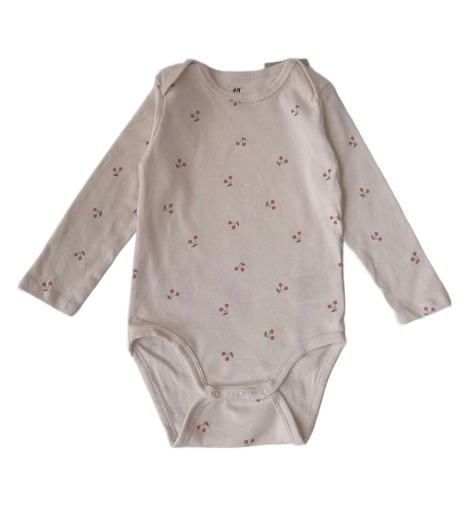 GHM1292Бодито е с дълъг ръкав, от органичен памук в цвят слонова кост и дребни фигурки на черешки.Марка: H&MСъстав: 100% памук