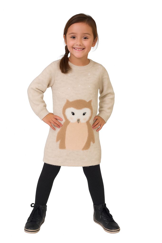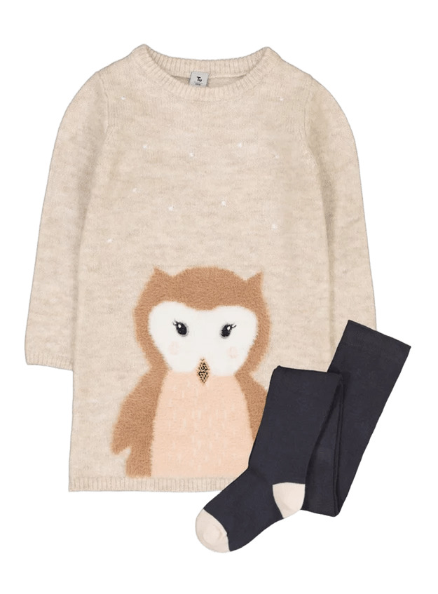 Комплектът се състои от рокля и чорапогащник. Роклята е от плътно плетиво в бежов цвят, с голямо изображение на бухалче в долния край. Фигурката е от двойно тъкана мъхеста прежда в млечнокафяво, бяло и розово, а човката е от златисти пайети. Чорапогащникът е в тъмен оловносив цвят.