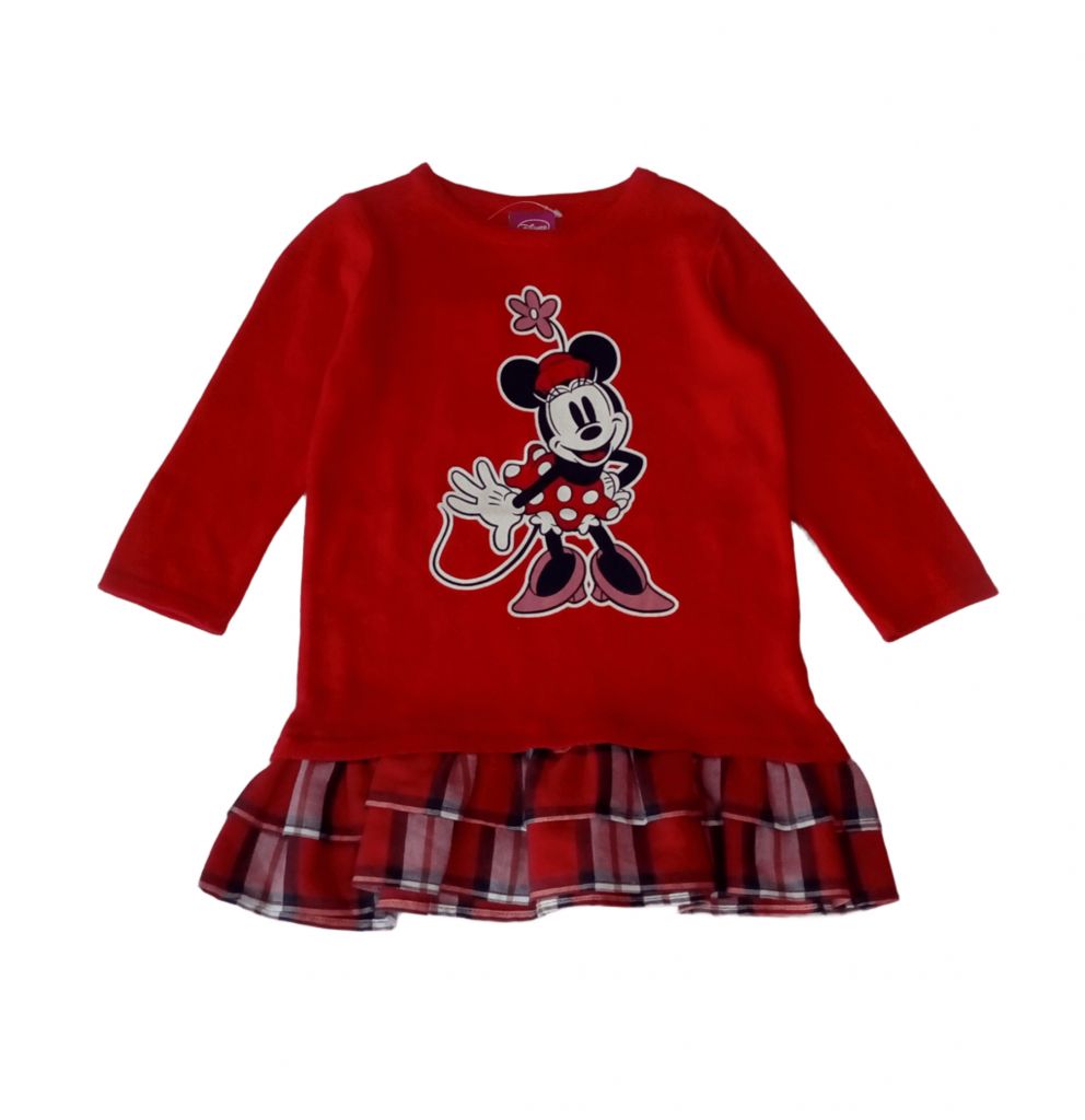 G1329Роклята е тънко плетиво в червено, с двоен кариран волан от плат отдолу и фигурка на Мини Маус отпред.Марка: GeorgeСъстав: 100% памук