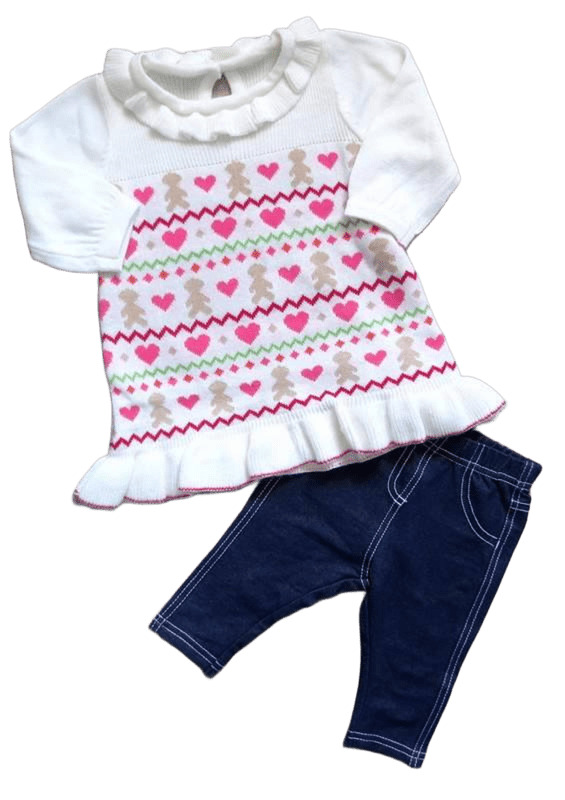Комплектът се състои от блузка и тъмносин джегингс. Блузката е тънко плетиво в бяло, с фигурки на мечета, сърчица и геометрични изображения в розов, зелен, оранжев и бежов цвят. Около деколтето и в долния край има къдрици.