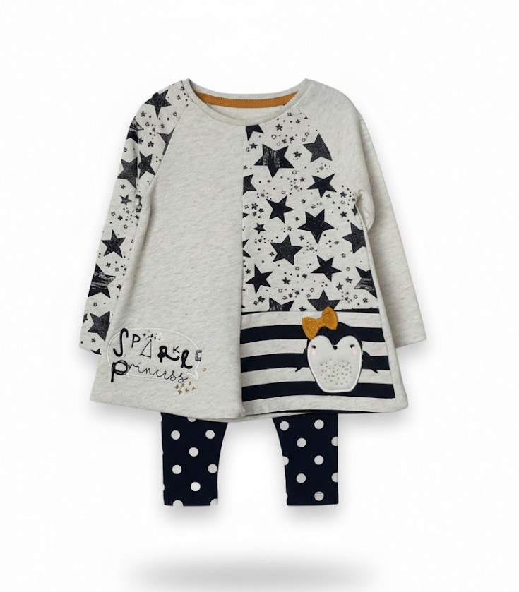 Комплектът се състои от туника и клин. Туниката е от плътно неватирано трико в цвят слонова кост, с асиметрични детайли. Десният ръкав и лявата предна половина са с изображения на различни по големина черни звездички. Под звездичките има ивица от широко черно-бяло райе с апликирано пингвинче и златиста панделка. В долния край на дясната половина има бродерия в черно и надпис "Sparkle princess". Клинчето е черно, с бели точки.