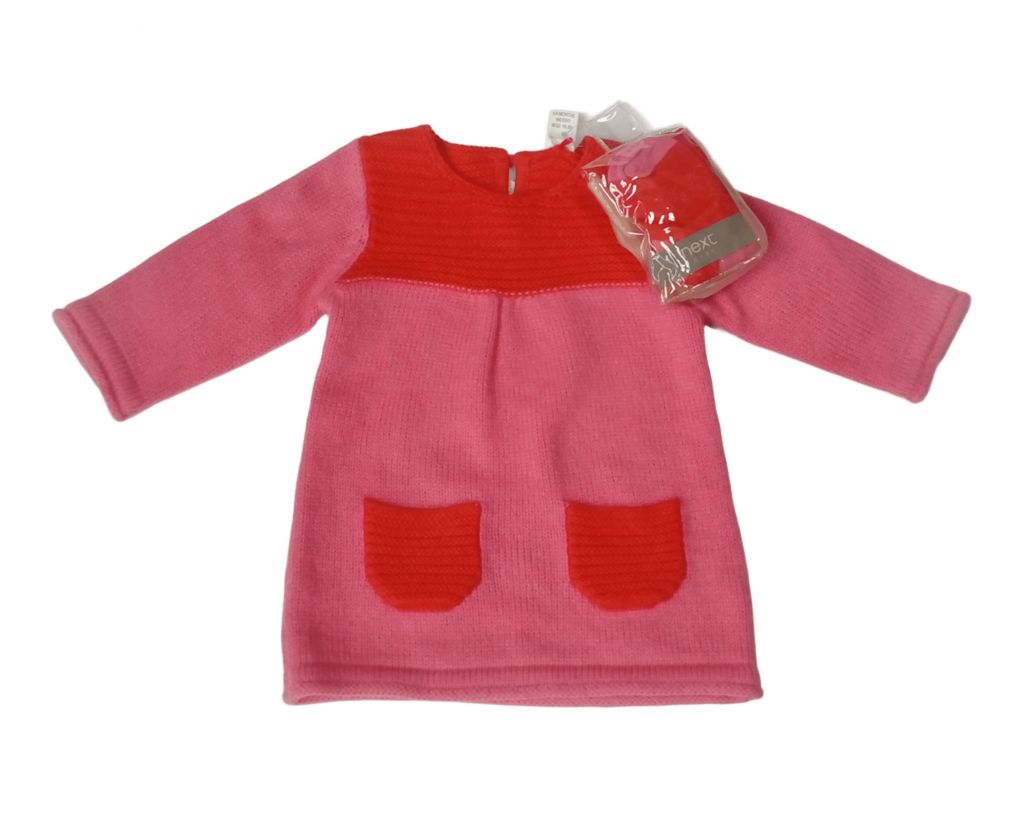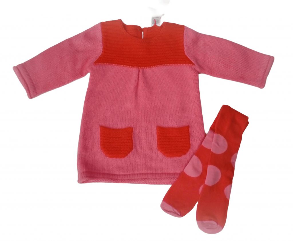 Комплектът се състои от рокличка и чорапогащник. Рокличката е плетена, с червена платка в областта на раменете и розова основна част. Има две малки джобчета в червено отпред. Закопчава се с едно копче на гърба. Чорапогащникът е червен, на големи розови точки.