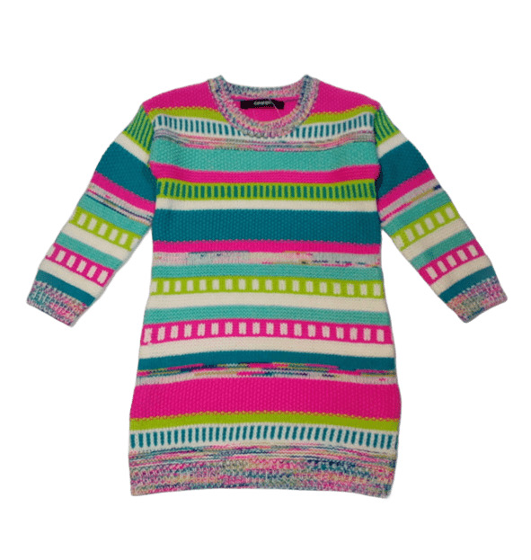 WGF3209Плътна плетена рокля на разноцветно райе в цикламено, бяло, тъмен и светъл тюркоаз, резеда и меланж. Цветовият ефект се подсилва от разнообразните модели плетки на рокличката.Марка: GeorgeСъстав: 100% акрил