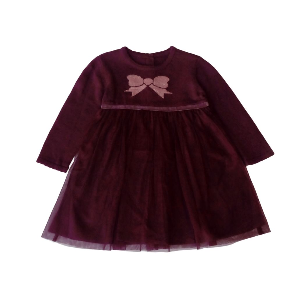 Роклята е в тъмен цвят бордо. Горната част е от тънко плетиво със светлорозова панделка отпред. Поличката е от два слоя, като долният е от памучен плат, а горният е от тюл.