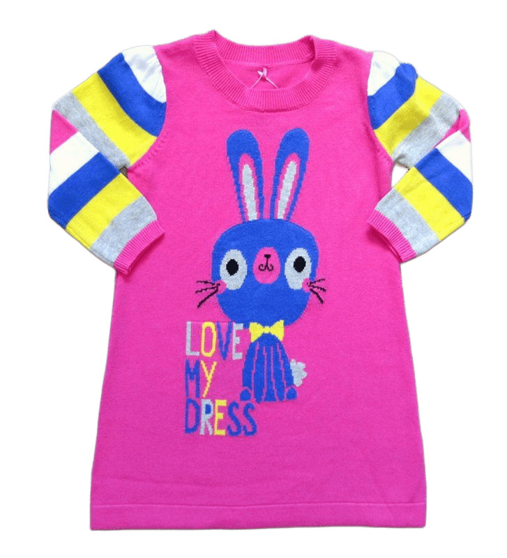 WGF1128Роклята е тънко плетиво, в тъмнорозов цвят. Ръкавите са на широки райета в бяло, синьо, жълто, сиво и розово. Отпред има фигурка на зайче и надпис " LOVE MY DRESS".Марка: GeorgeСъстав: 100% памук