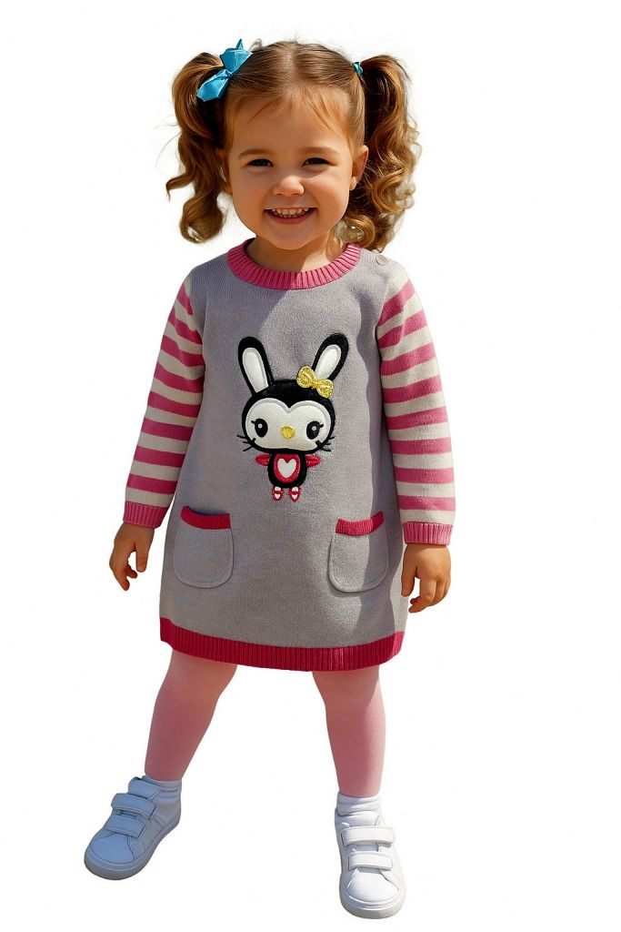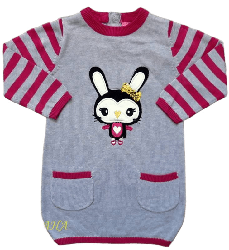 Роклята е тънко плетиво в сив цвят, а ръкавите са на широко райе в тъмнорозово и сиво. Има две джобчета и фигурка на зайче, апликирана с плат и пайети. На гърба има три тик-так копчета за по-лесно обличане.