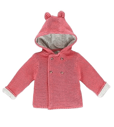 MSR216Жилетката е в цвят диня, плътно плетиво с двуредно закопчаване. Има сива трикотажна подплата, а качулката е с ушички.Марка: M&SСъстав: 100% памук