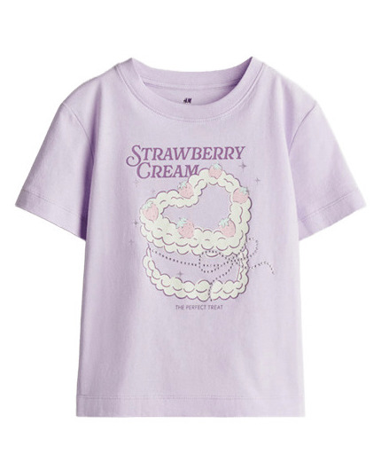 GHM1367Тениската е в млечнолилав цвят, с голяма фигурка на торта, надпис SRAWBERRY CREAM и нежна панделка от сребристи камъчета.Марка: H&MСъстав: 100% памук