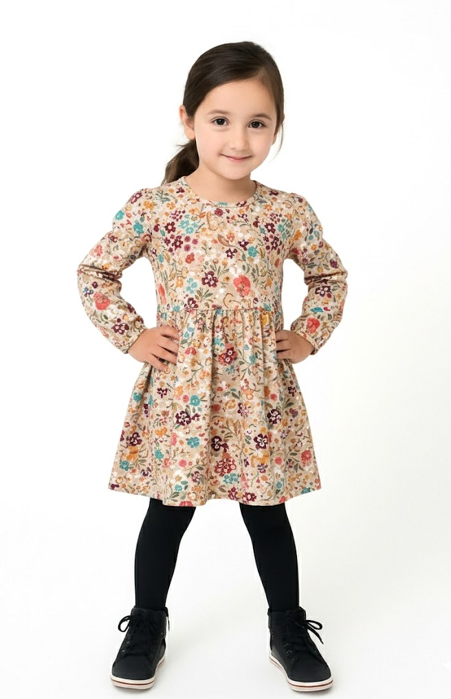 Роклята е с дълъг ръкав, в бежов цвят на пъстри цветчета в бордо, жълто, розово и зелено и дребни фигурки на зайчета и лисици. Долната част е трапецовидно разкроена, с набор в областта на талията.