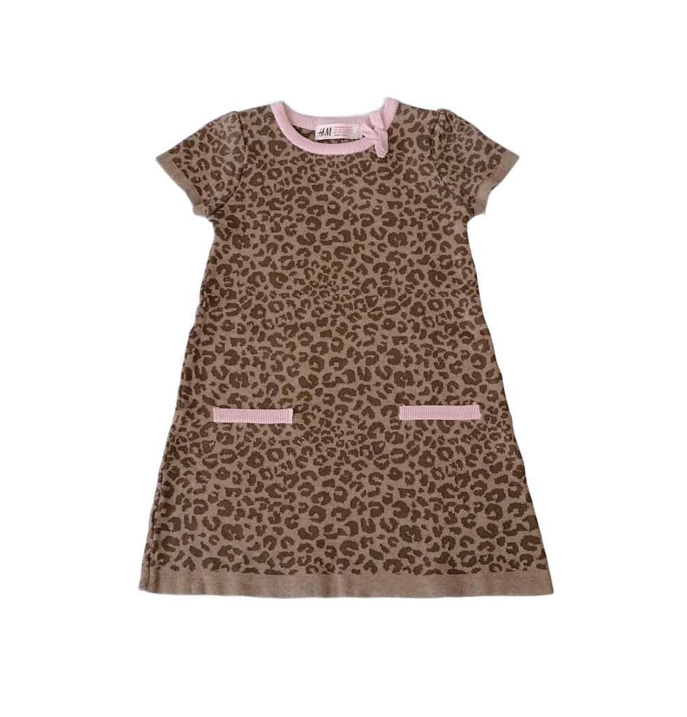 WHMF2120Рокличката е машинно плетена, с къс ръкав, в кафяво с тъмнокафява леопардова шарка. Има декоративна имитация на джобчета и кант около деколтето с панделка в светлорозов цвят.Марка: H&MСъстав: 100% памук