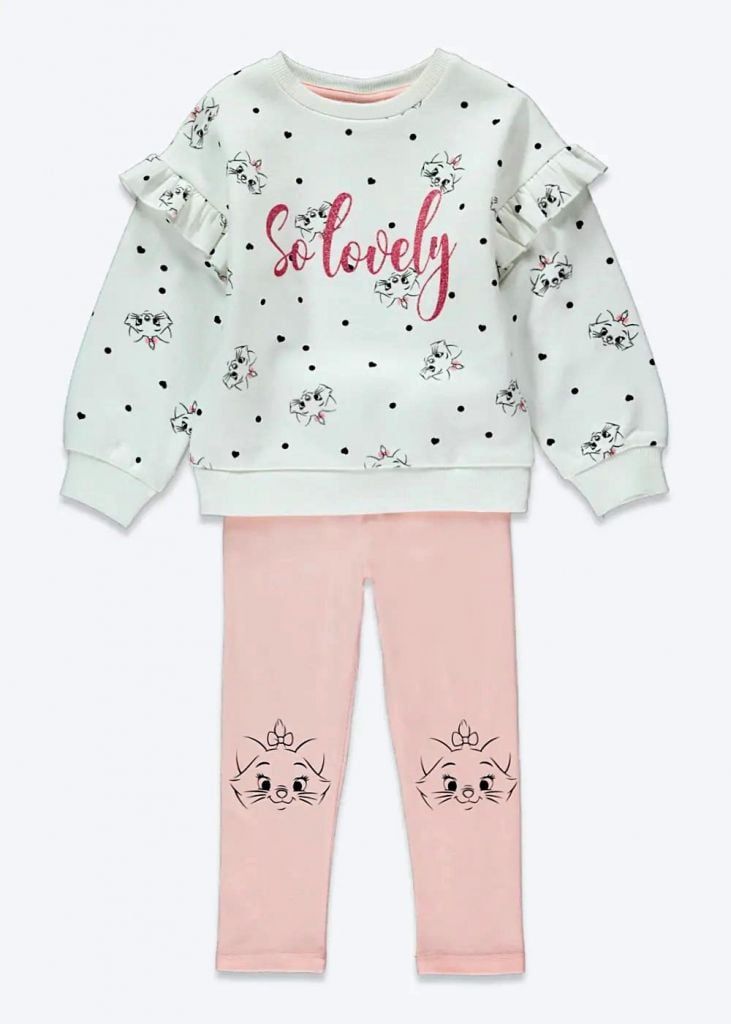 Комплектът се състои от блуза и клин. Блузата е бяла, леко ватирана, с къдрици на раменете. Има дребни фигурки на котенца, черни сърчица и точки и надпис "So lovely" с розов брокат. Клинчето е бледорозово, с черни котенца на крачолите отпред.