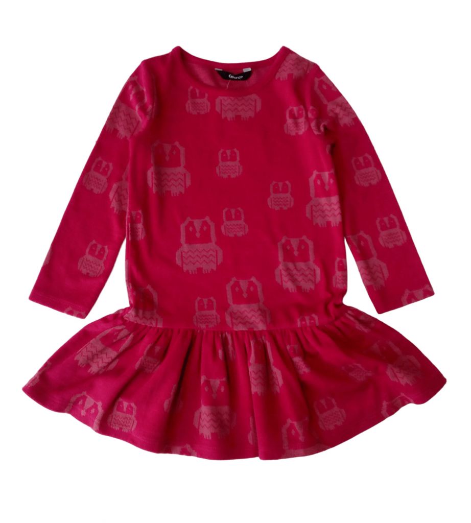 WGF2113Роклята е тънко плетиво в тъмнорозов цвят, със светли изображения на бухалчета. Кройката е права, с набор в долната част.Марка: GeorgeСъстав: 98% полиестер, 2% еластан
