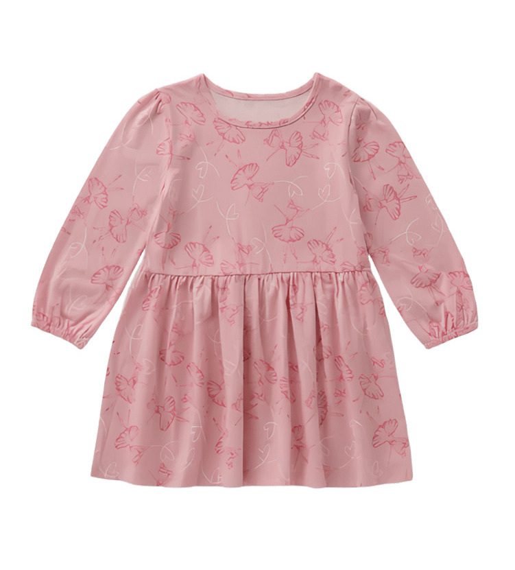 Роклята е с дълъг ръкав, в цвят пепел от рози и фигурки на тъмнорозови балерини. Долната част е трапецовидно разкроена, с набор в областта на талията.