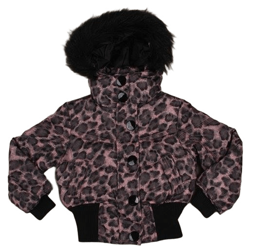 Якето е с леопардов десен в розово, сиво и черно. Има широк ластик отдолу, два джоба, закопчаване с цип и допълнителна платка с големи черни копчета тик-так.. Качулката е неподвижна, с пухена ивица с дълъг косъм по края. Вътрешността е от пресована вата, подплатата е от шушляков плат.