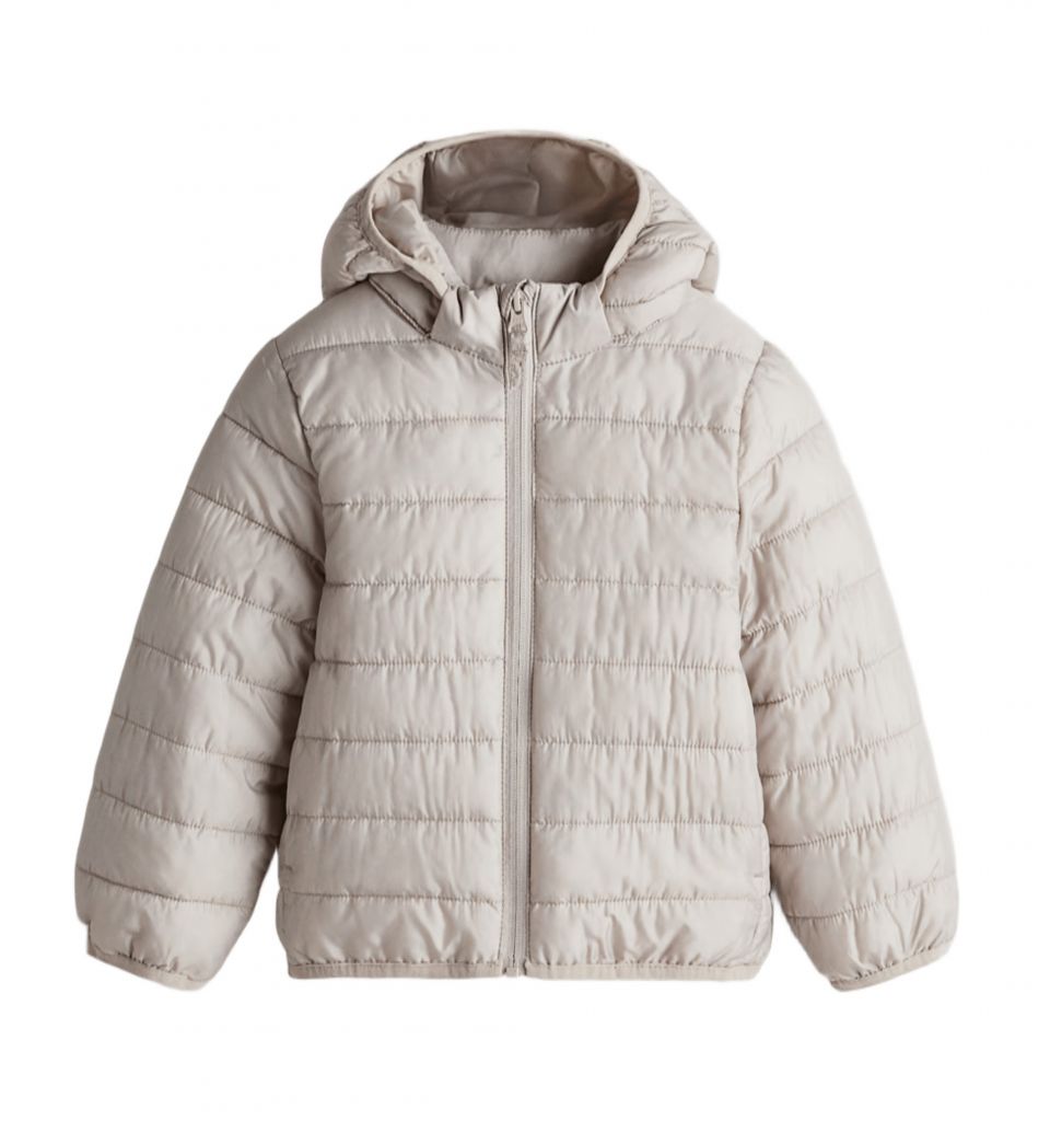 Олекотено преходно унисекс яке в бежов цвят, с подвижна качулка и два джоба.