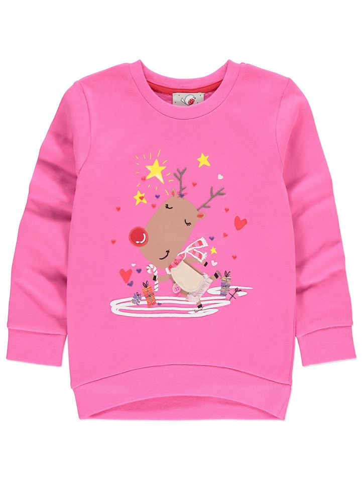 AGE416Блузата е ватирана, в наситенорозов цвят. В предната част има изображение на пързалящо се еленче, комбинация от щампа и апликация с плат.Марка: GeorgeСъстав: 100% памук