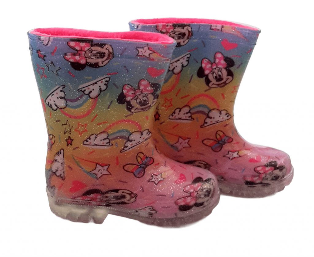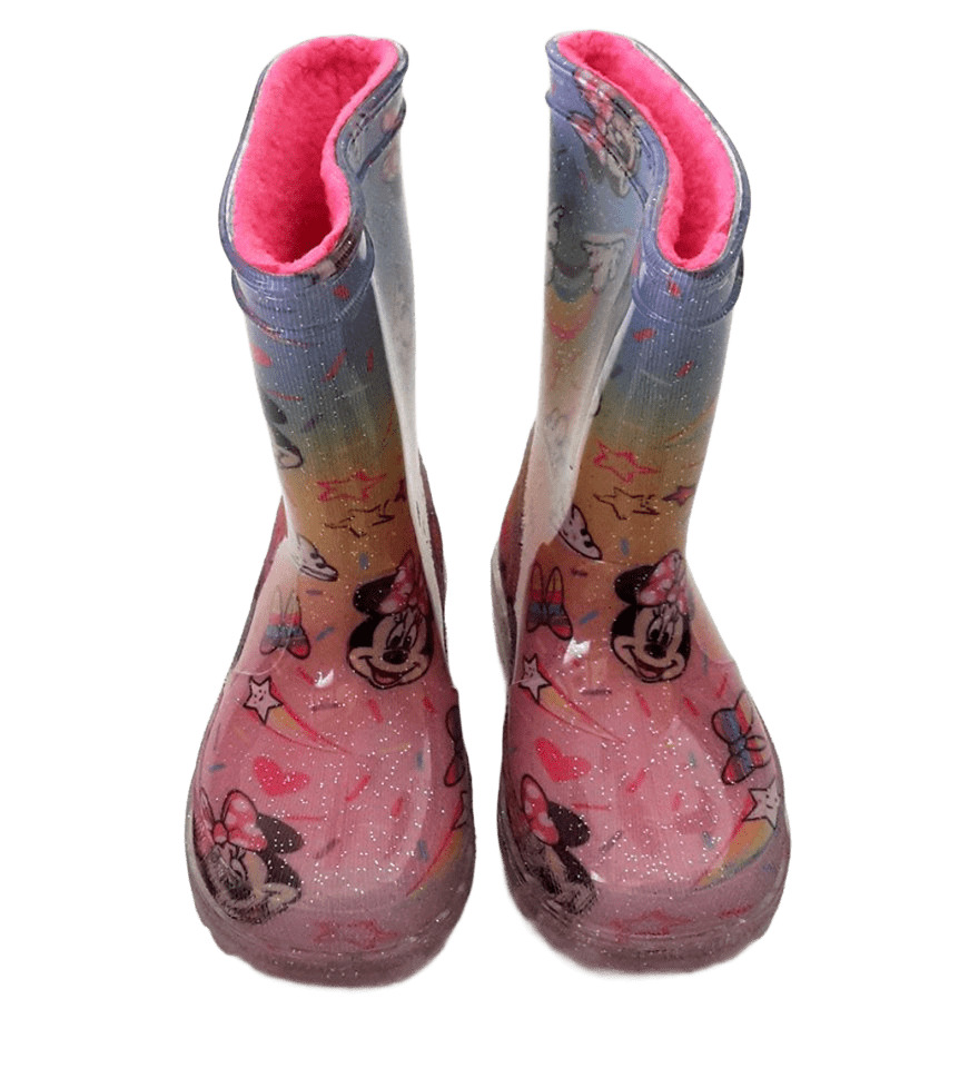 Ботушките са с ватирана подплата. Долната част е в преливащи цветове с дребни изображения на Мини Маус, облачета и звезди. Горната гумена част е прозрачна, с частици сребрист брокат. Подметките също са прозрачни и светят в лилаво при ходене.