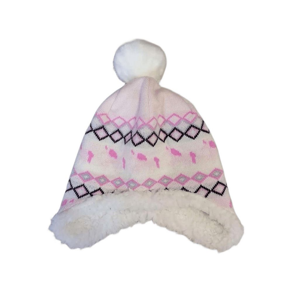 GGE4042Шапката е тип ушанка, в бледорозов цвят, с хоризонтални редове от ромбове в тъмнорозово и кафяво Има бял пискюл и мека поларена подплата.Марка: GeorgeСъстав: акрил, полиестер