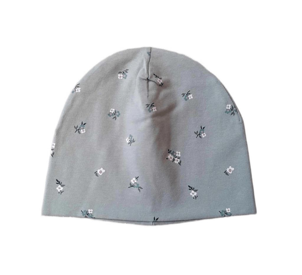 Тънка шапка от мек трикотажен плат в цвят мента, с дребни бели и сини цветчета.